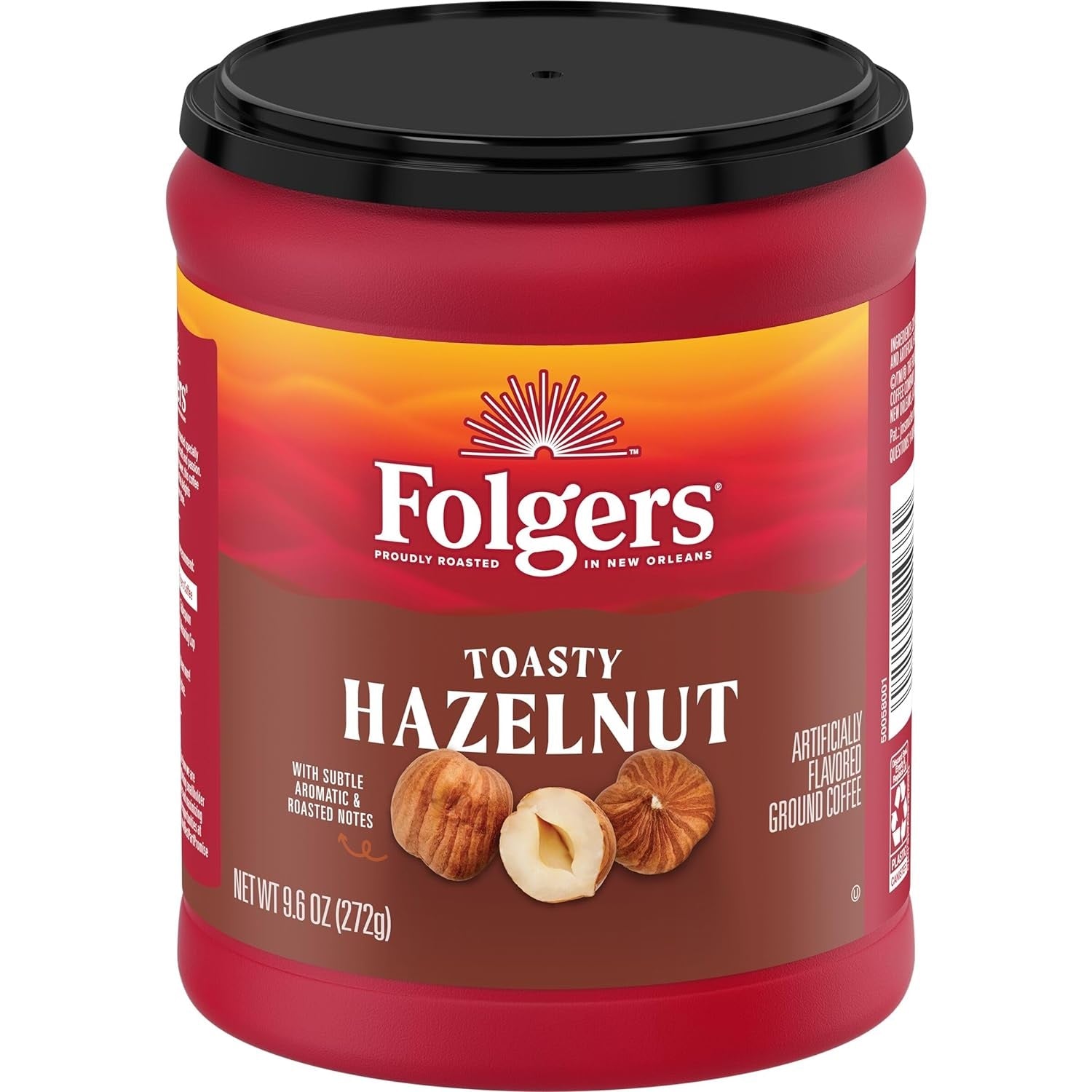 - Contains one (1) 9.6 oz. canister of Folgers Toasty Hazelnut artificially flavored coffee