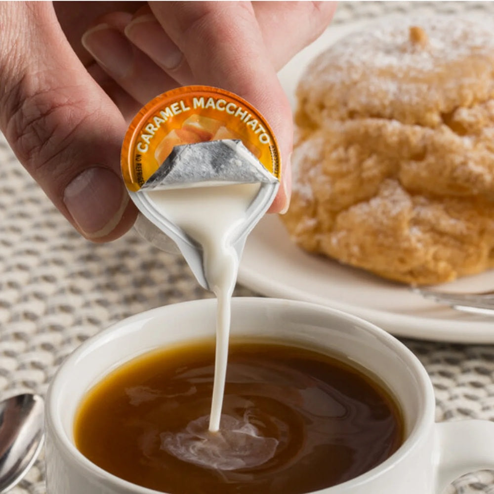 Start your morning right with a sweet splash of caramel Macchiato flavor. International Delight French Caramel Macchiato Coffee Creamer transforms your cup of coffee into a world of fantastic flavor. This set is a coffee lover’s dream, Serving Size Pods, perfect for purse, pantry, or flavor emergencies—and no refrigeration needed! These single-serve creamers are both gluten- and lactose-free.