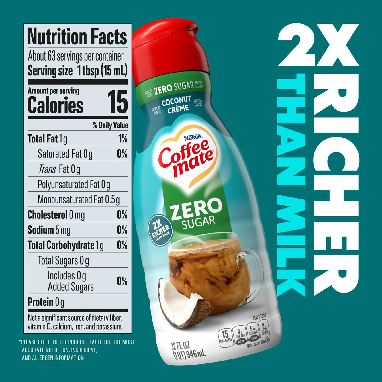 Nestle Coffee Mate Zero Sugar Coconut Creme Liquid Coffee Creamer, 32 fl oz Bottle